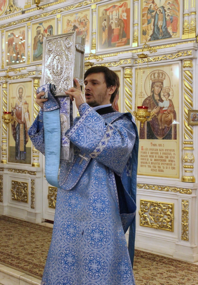 Во время полиелейной утрени духовенством собора было совершено величание иконы праздника. После прочтения отрывка из Евангелия владыка совершил помазание прихожан освященным елеем.